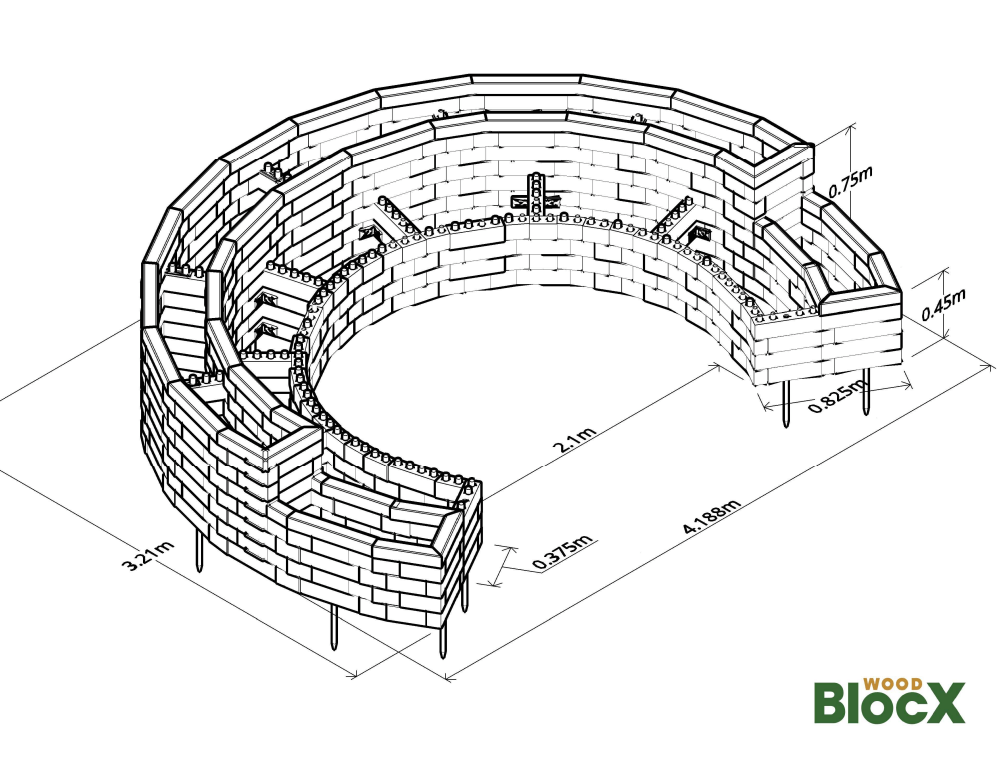 Kruhové stavby WoodBlocX patří mezi technicky nejzajímavější projekty, protože při nich nepracujeme s dlouhými bloky, ale s krátkými 2–4děrovými bloky o délce 15–30 cm. Pro vytvoření dokonalého kruhu používáme tři speciální varianty: