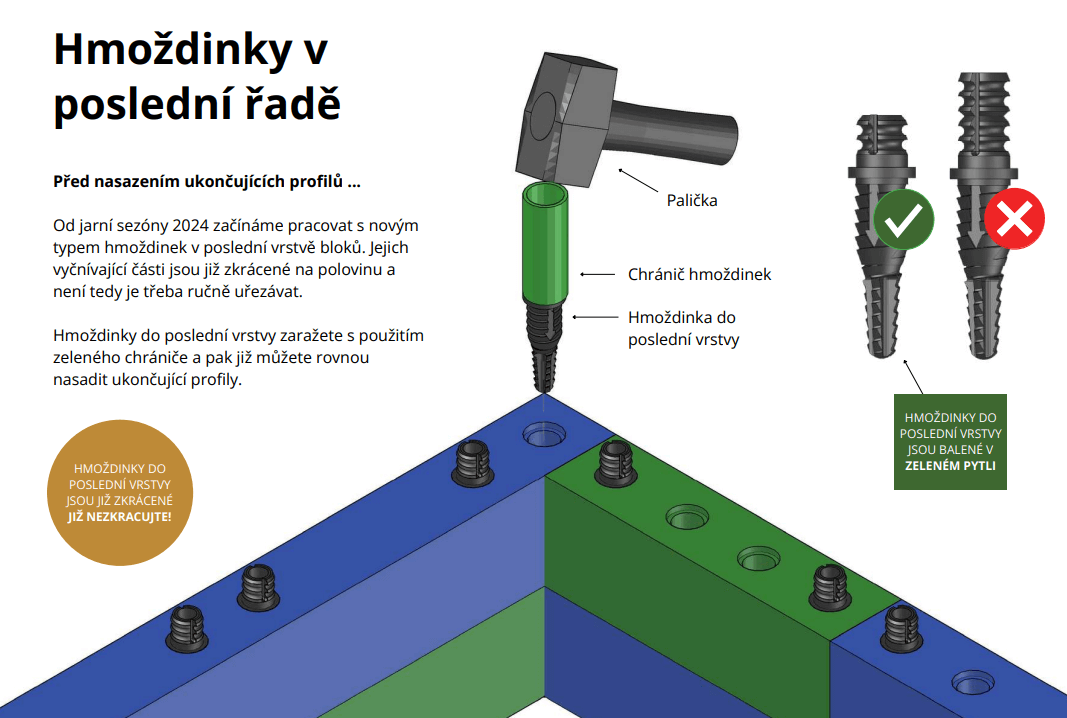 I malá změna může znamenat velký rozdíl. To je případ i naší poslední novinky – úpravy hmoždinek, jedné z klíčových součástí systému WoodBlocX. Hmoždinky do poslední vrstvy jsou dodávány již zkrácené, takže na ně ukončovací profily dokonale padnou a vy už nemusíte nic řezat.