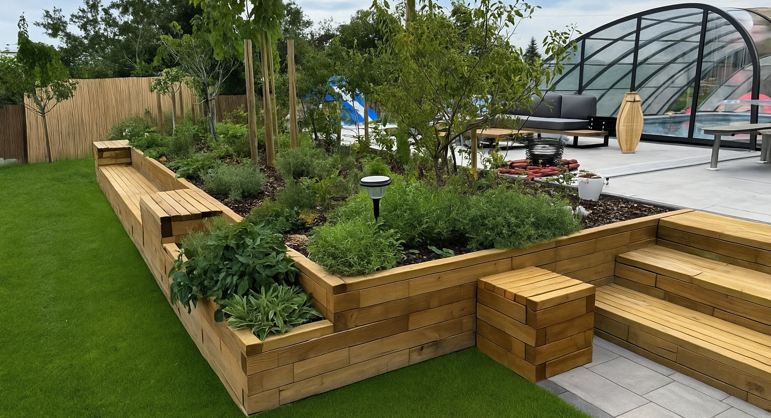 Zahradní oáza s opěrnou zídkou, posezením a krytým bazénem.