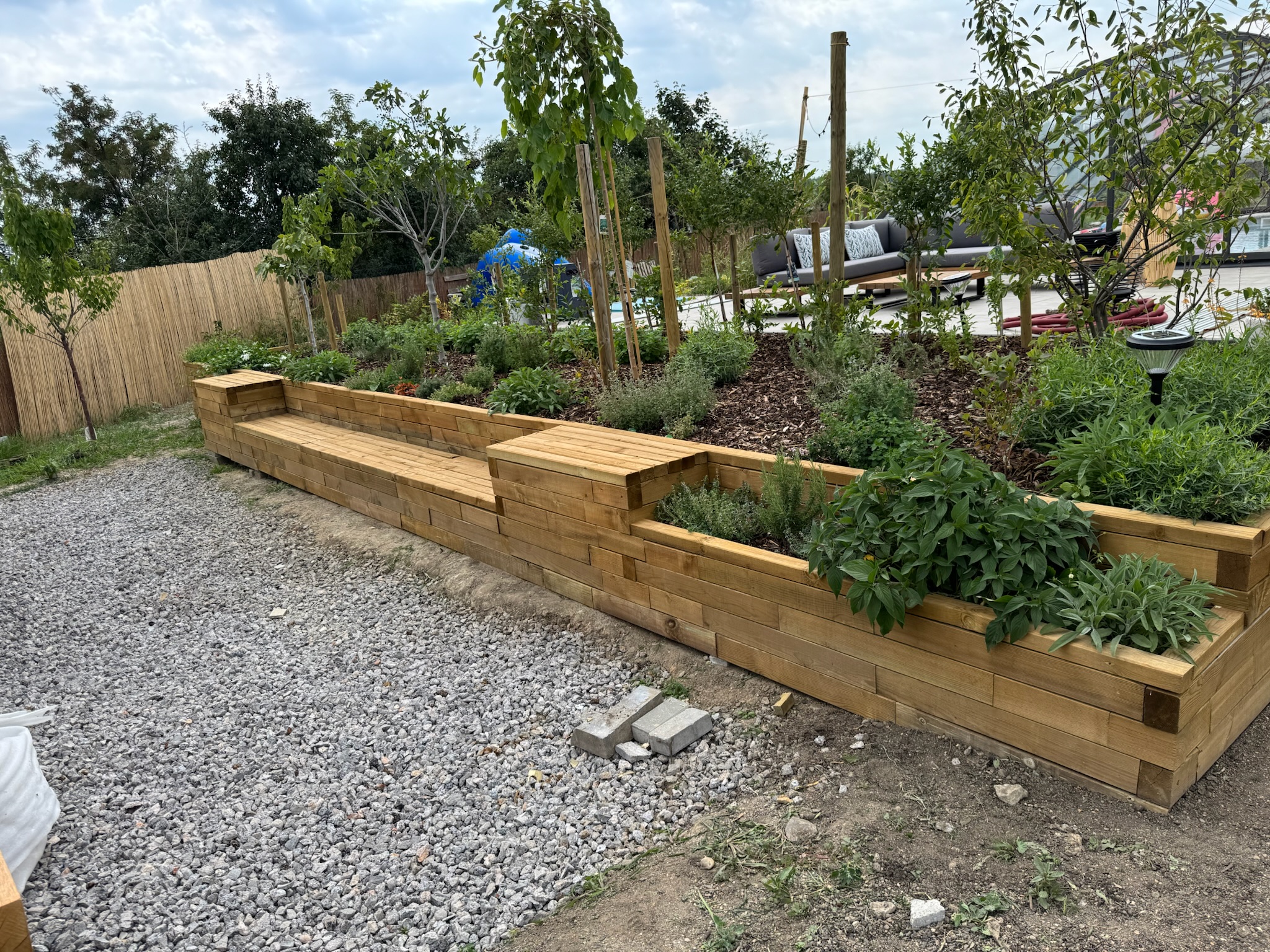 Hlavní dominantou prostoru je dřevěná opěrná zídka ve tvaru U, která propojuje vyvýšený záhon, posezení i schody do jednoho řešení. Tato promyšlená konstrukce přináší do zahrady nejen svěží zeleň, bylinky a mladé stromky, ale i praktické lavičky s nádherným zátiším v podobě bazénu a terasy.