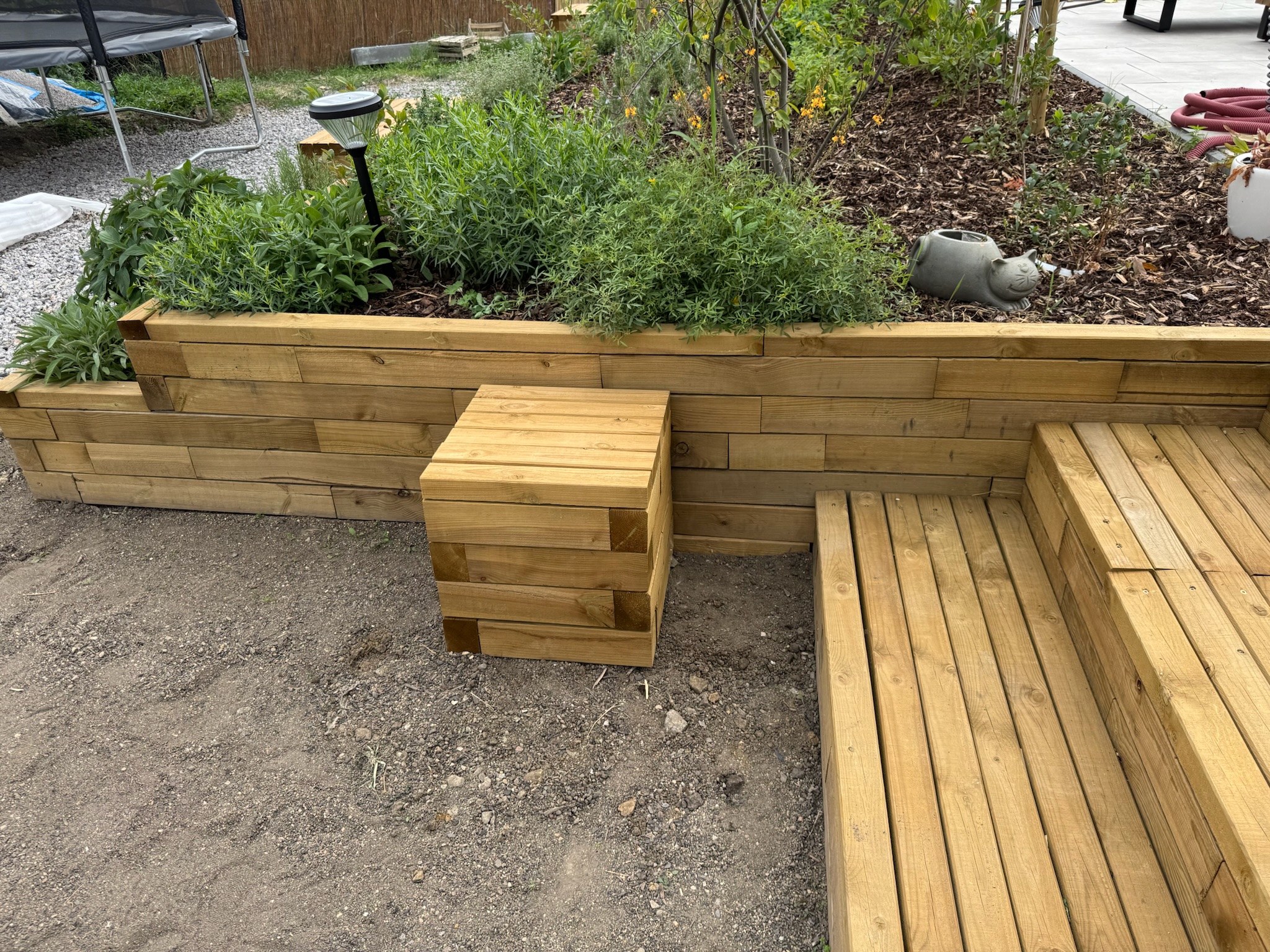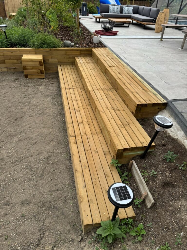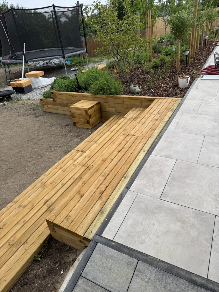 Opěrná zídka, která dříve řešila jen terénní problém, se změnila v srdce celé zahrady – funkční, stylové a pohodlné místo pro život venku.