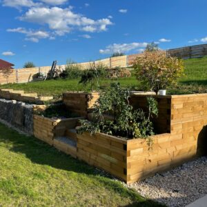 Navrhujeme zahradní řešení výhradně pomocí systému WoodBlocX – tedy vyvýšené záhony, opěrné zdi, schody a terénní prvky. Nevytváříme výsadbové plány ani kompletní zahradní architekturu (pergoly, cesty apod.).