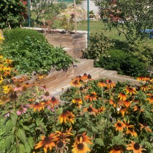 Kaskádovité vyvýšené záhony, schody a opěrné zídky pomáhají: