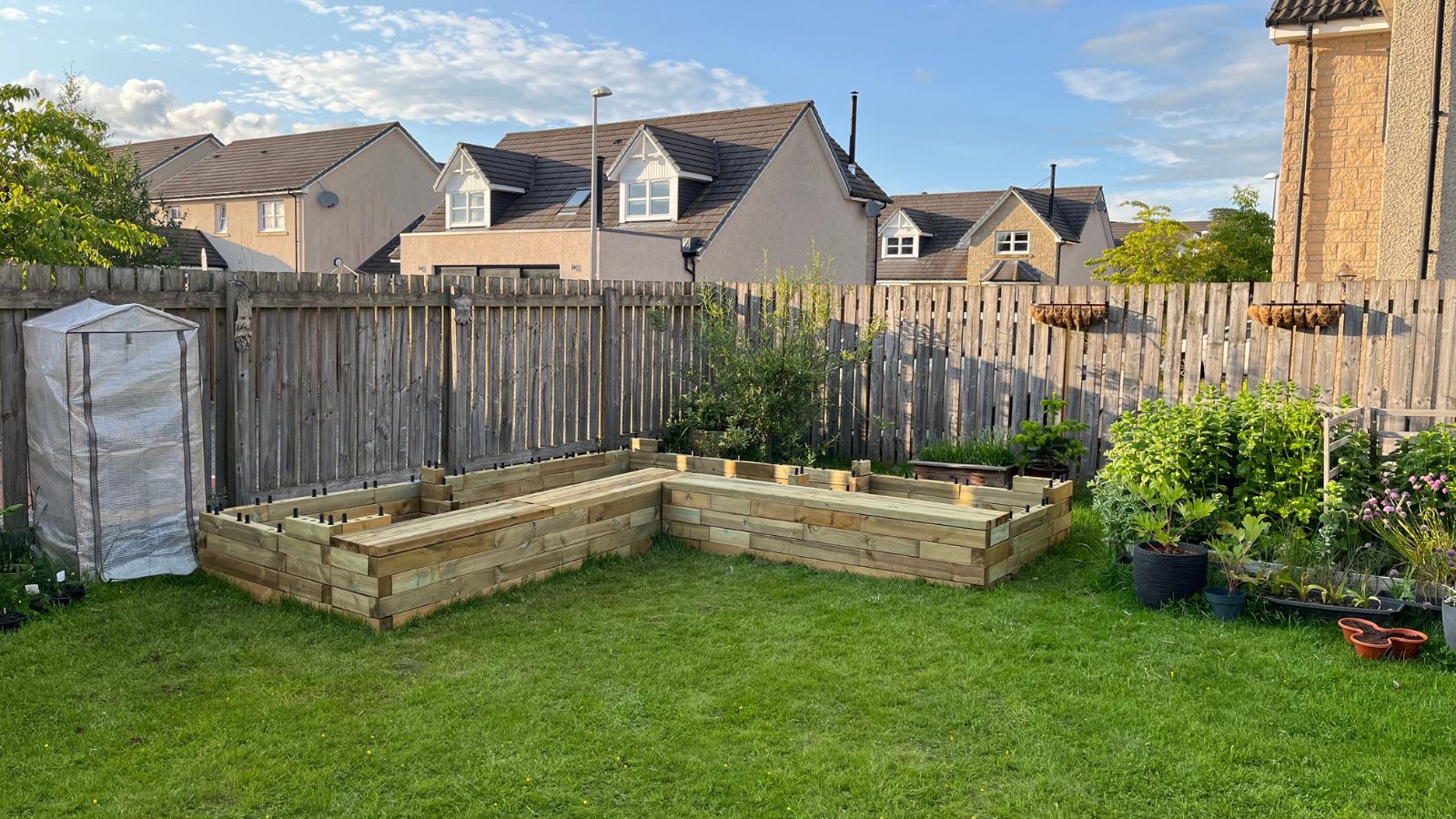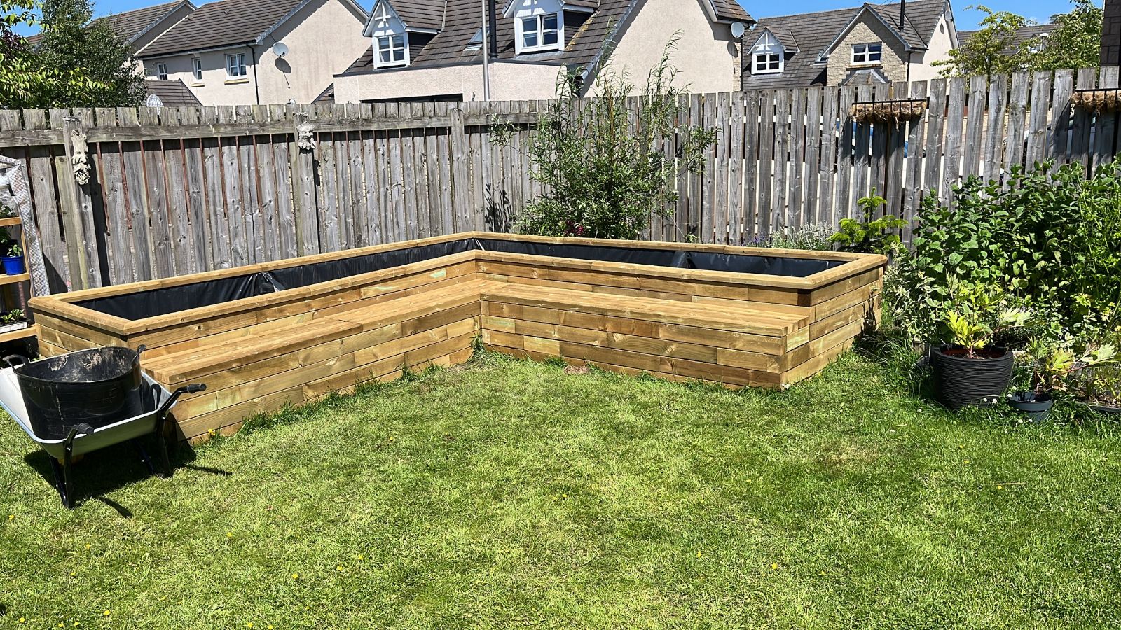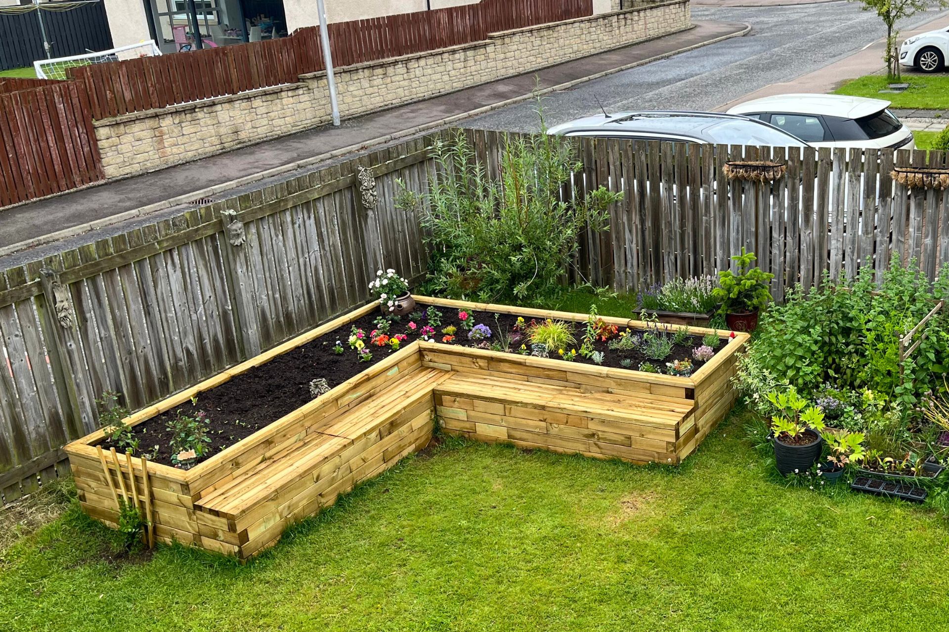 Tento projekt WoodBlocX zahrnuje velký vyvýšený záhon ve tvaru písmene L s integrovanou lavičkou, který je navržen tak, aby se perfektně vešel do rohu zahrady zákazníka. Díky stavebnicovému systému WoodBlocX je možné tvar i velikost přizpůsobit každé zahradě.