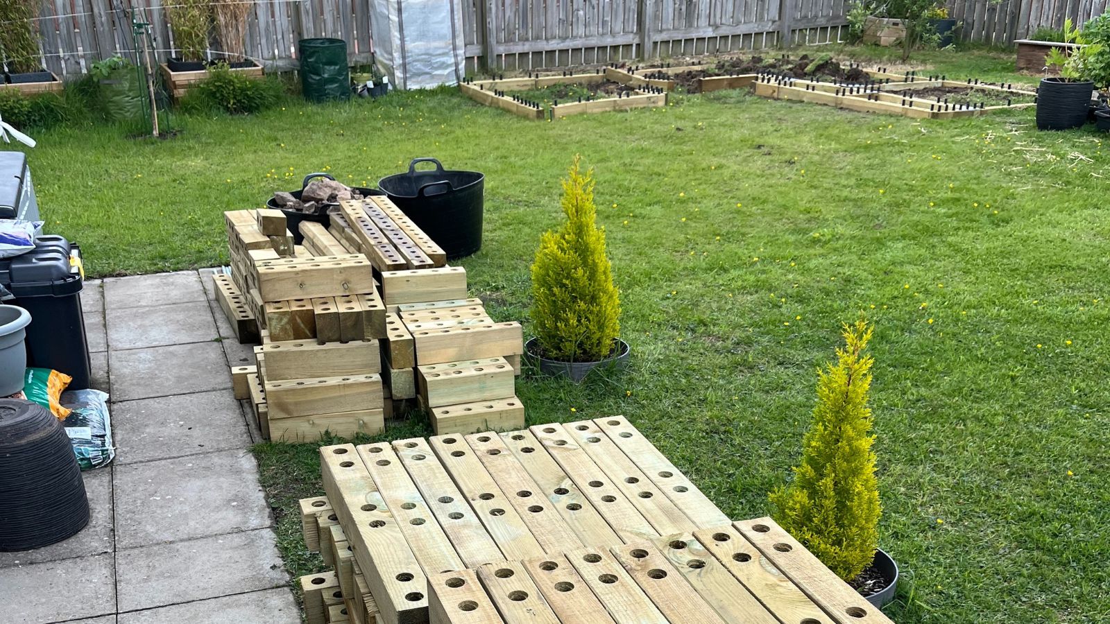 David chtěl propojit dvě věci – prostor pro pěstování rostlin a pohodlné místo k odpočinku. Ideálním řešením se ukázala být naše velká sestava WoodBlocX ve tvaru L, která má i vestavěné posezení.