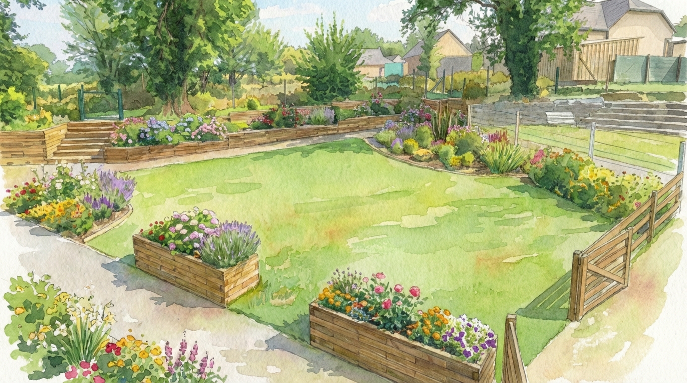 Proměna s opěrnou zídkou a vyvýšenými záhony