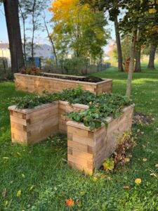 Ústředním bodem zahrady se stal velký vyvýšený záhon. Díky výšce je pohodlně přístupný seniorům, umožňuje snadnou péči o rostliny a přirozeně oživuje prostor svou výraznou linií. Konstrukce záhonu zároveň pomáhá jasně vymezit zahradní část a dodává místu nový charakter.