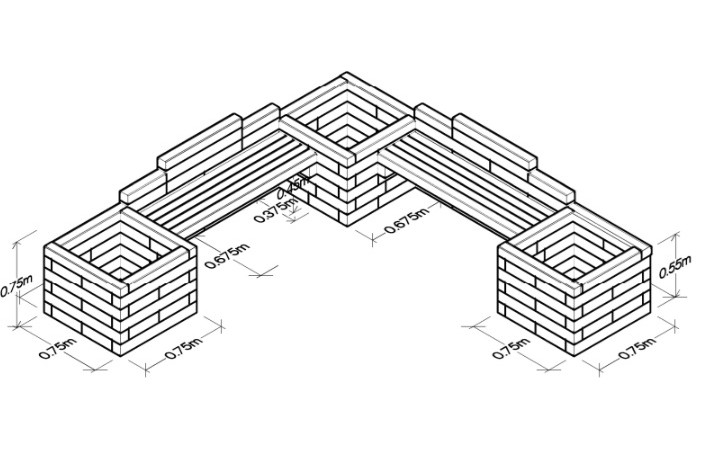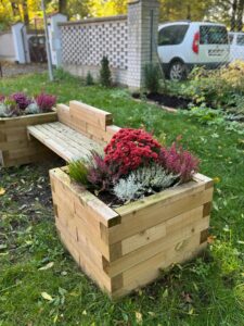 Do jednoho z rohů jsme navrhli a osadili rohovou lavičku s truhlíky. Kombinuje pohodlné posezení s možností blízkého kontaktu s rostlinami. Lavička vytváří přirozené místo k zastavení, odpočinku i setkávání a stala se oblíbeným bodem zahrady.