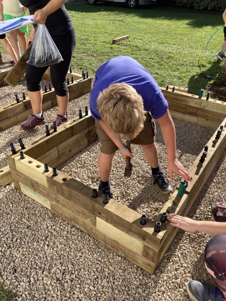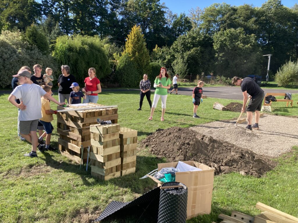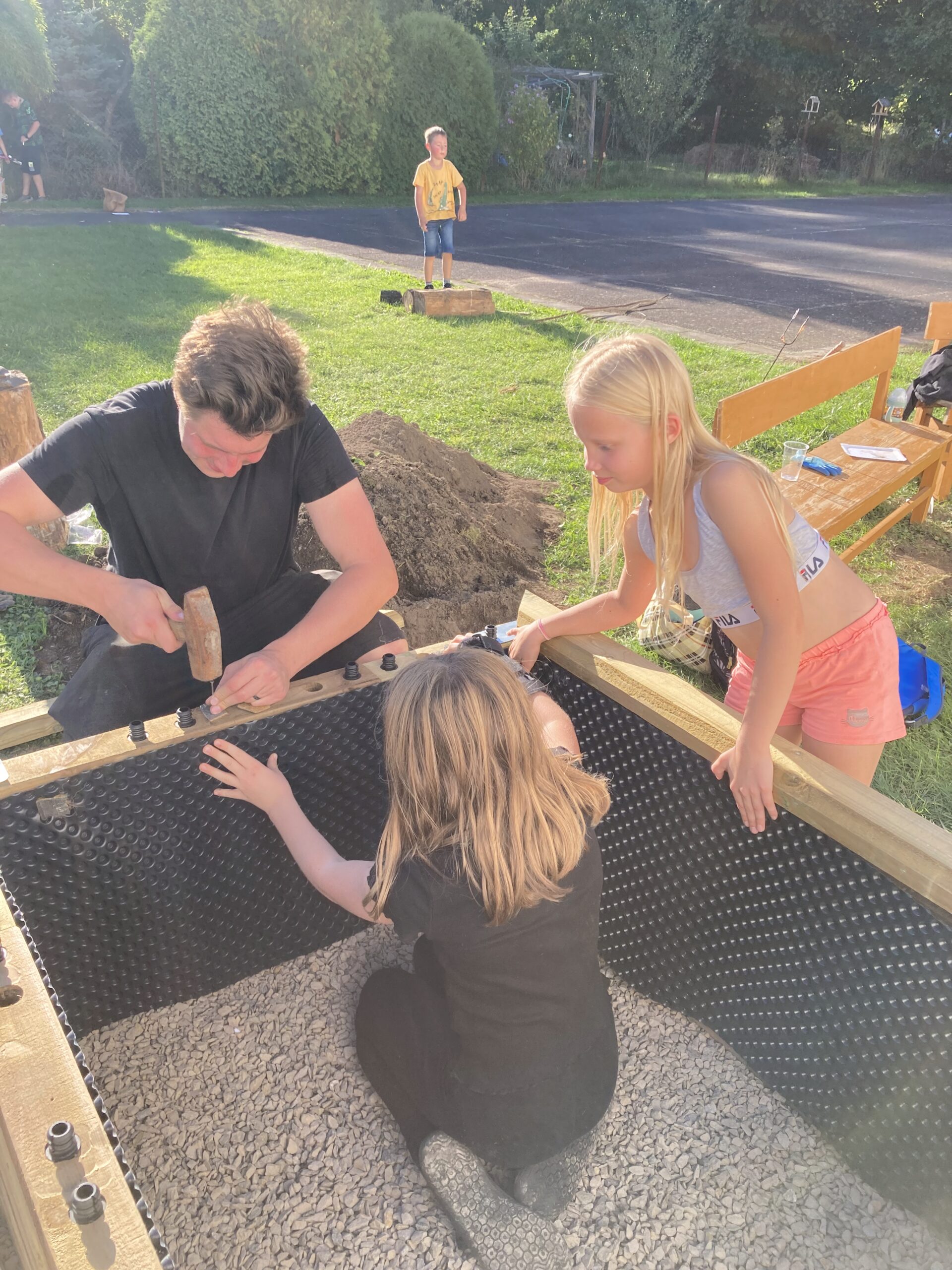 Samotná stavba záhonů proběhla během komunitního odpoledne, kterého se zúčastnili nejen zaměstnanci školy a školky, ale také rodiče, děti i přátelé školy. Společně připravili terén, sestavili záhony ze stavebnice WoodBlocX a ještě si u toho upekli buřty. Celé odpoledne se neslo v duchu spolupráce a dobré nálady – i ti nejmenší přiložili ruku k dílu.