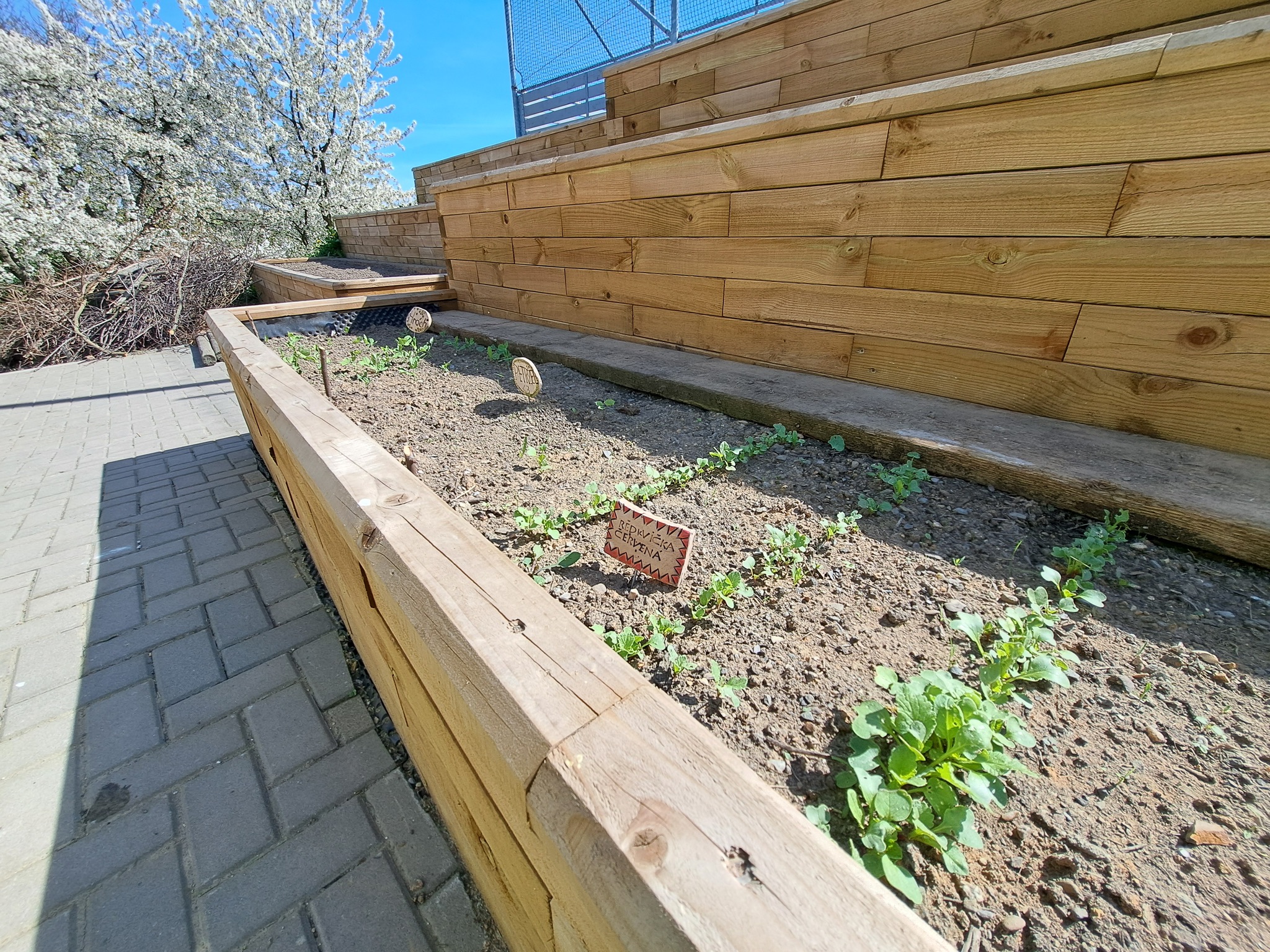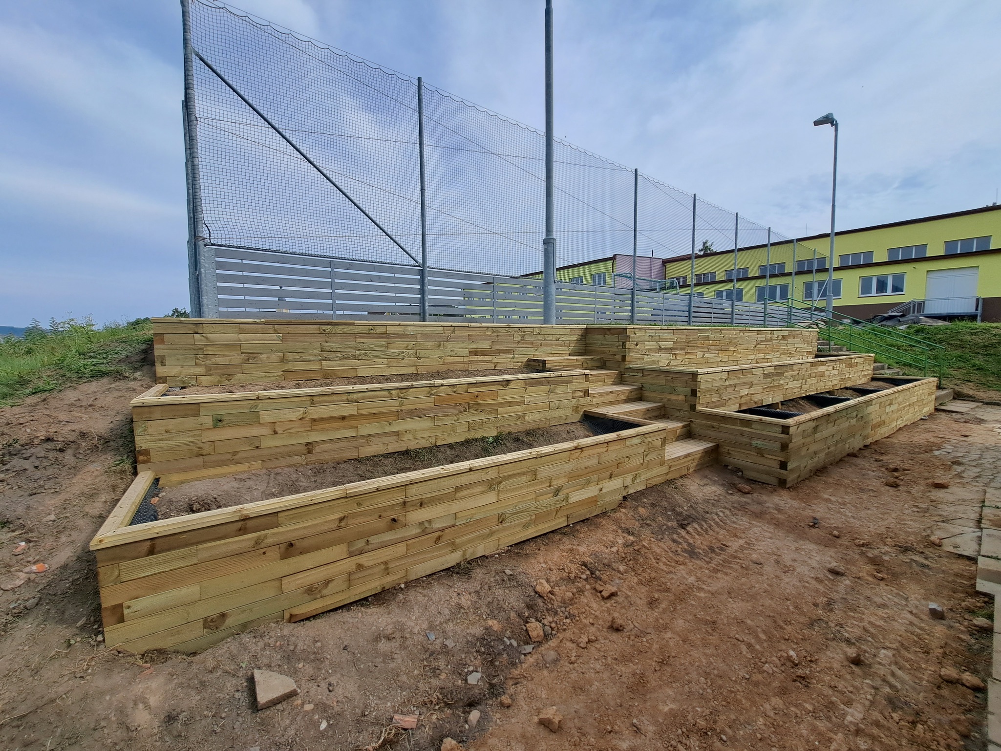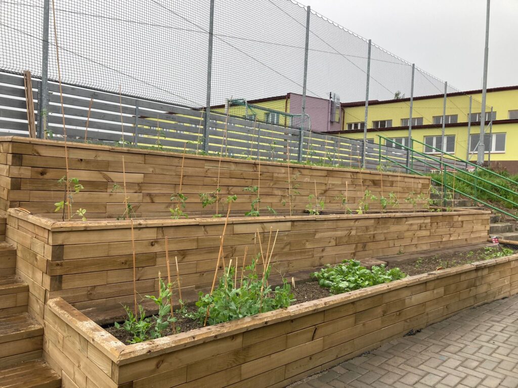 Původně nevyužitý a obtížně přístupný svah se díky našemu návrhu stal oblíbeným místem dětí i pedagogů. Nové dřevěné záhony a schody umožnily bezpečný pohyb po svahu a přinesly do školního areálu nový rozměr — prostor pro setkávání, výuku i relaxaci.