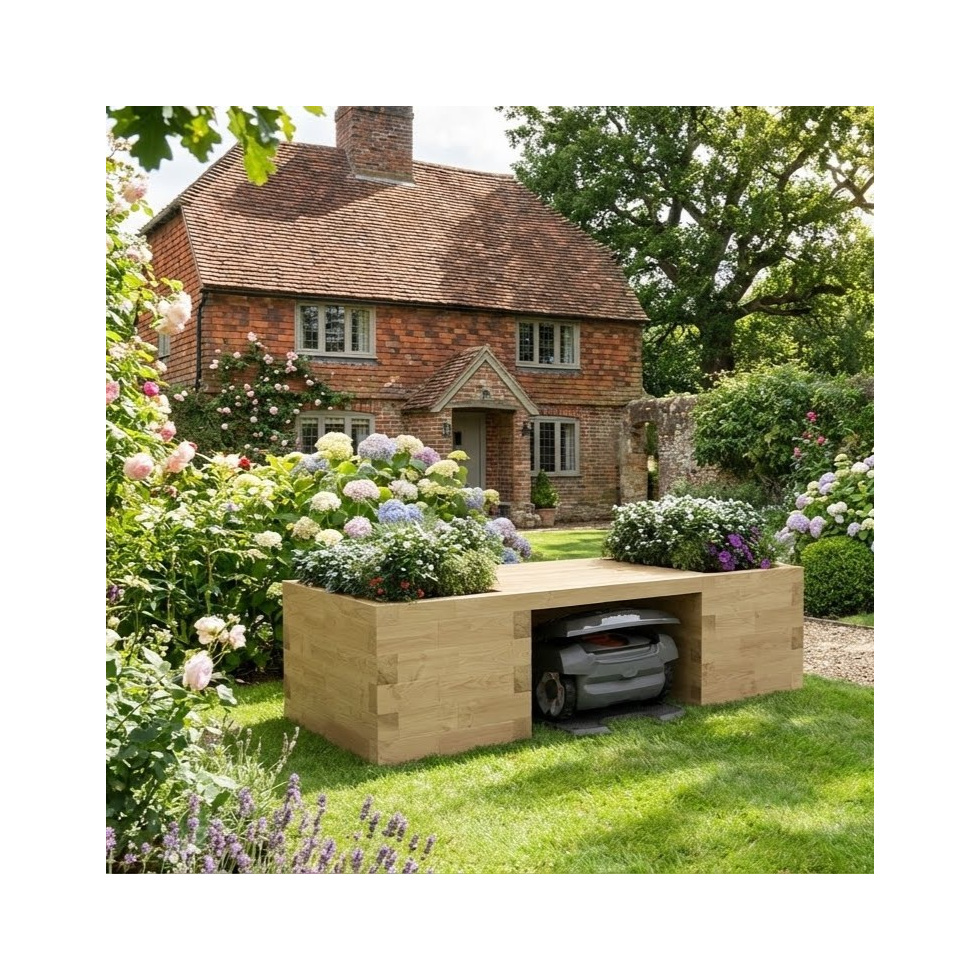 Váš zahradní pomocník si zaslouží krásný nový domov. Díky dvěma truhlíkům a místu sezení bude tento domek pro robotickou sekačku vypadat, jako kdyby do vaší zahrady patřil odjakživa.