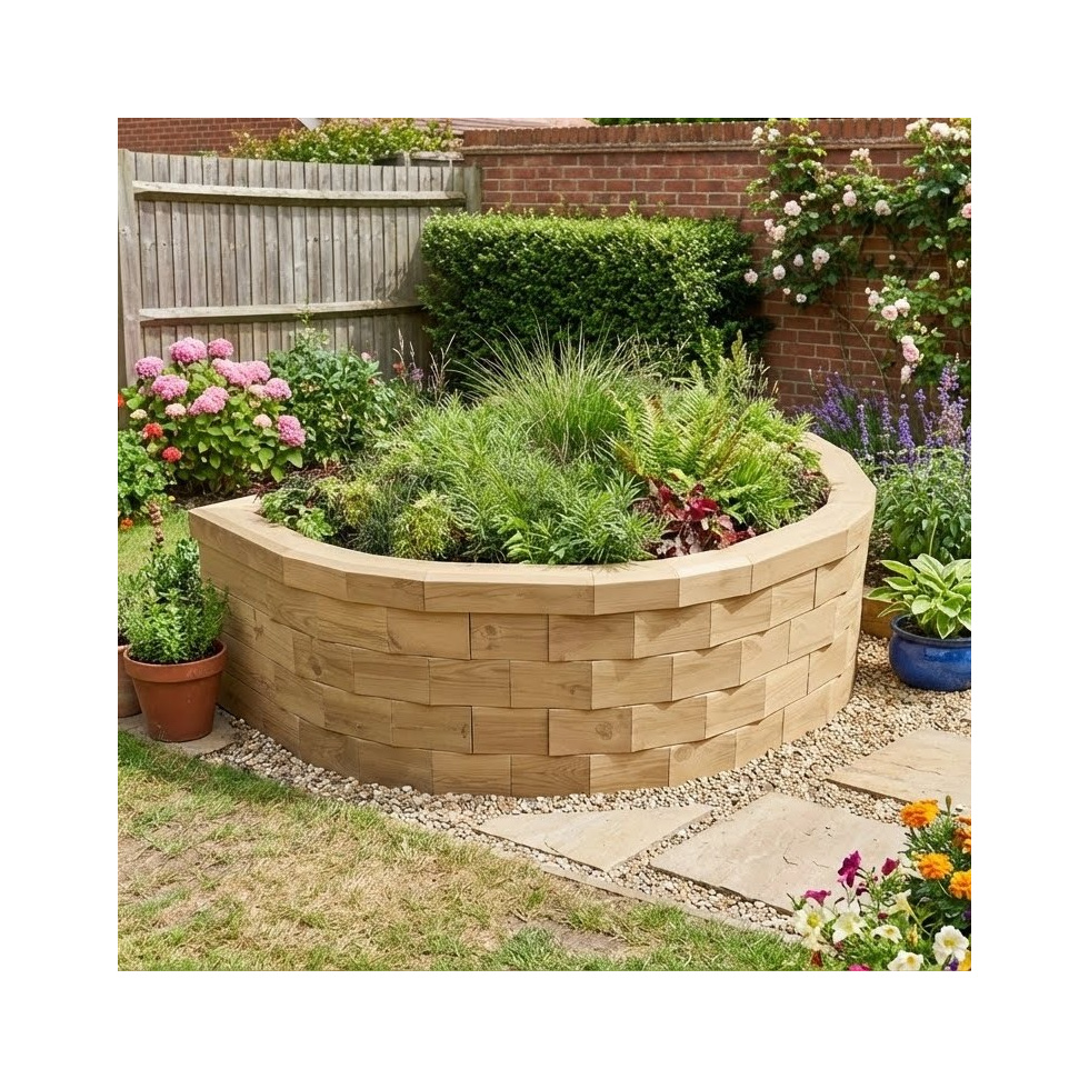 Tento malý půlkruhový záhon je ideální pro zjemnění klasických lineárních zahrad či teras, ho lze kombinovat s dalšími tvary a vytvořit tak zajímavé kompozice vyvýšených záhonů.