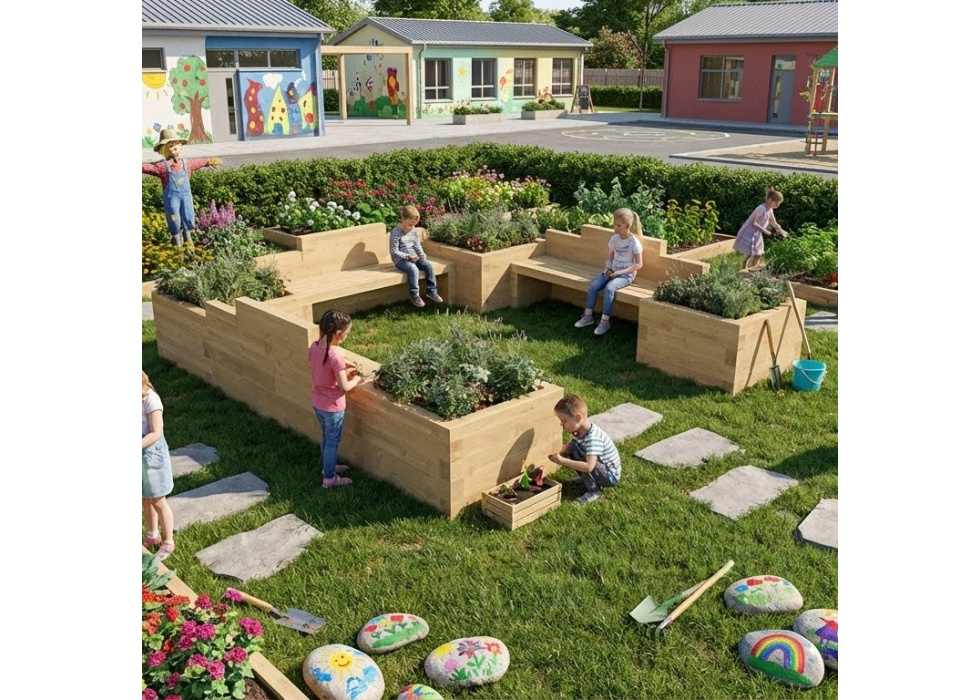 Spousta místa k sezení se sníženými sedáky i pro krátké dětské nožičky. Díky třem lavičkám a čtyřem truhlíkům si děti užijí čas strávený venku společným sázením a péčí o květiny, bylinky, ovoce či zeleninu - cokoliv jen si budou přát - a umožní jim tak sledovat, jak se diky jejich práci a péči rostlinám daří a z nich samotných se stávají opravdičtí zahradníci. Tato sestava je také k dispozici v extra dlouhé velikosti.