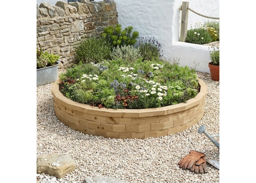 Tento velký kruhový vyvýšený záhon je ideálním řešením do moderních zahrad. Začleněním oblých tvarů do umírněných zahrad a pravoúhlých tvarů zjemníme jejich vzhled. Pro umocnění dojmu můžete využít i vyvýšené záhony s využitím oblouků nebo kosých rohů, které se k tomuto kruhovému skvěle hodí.