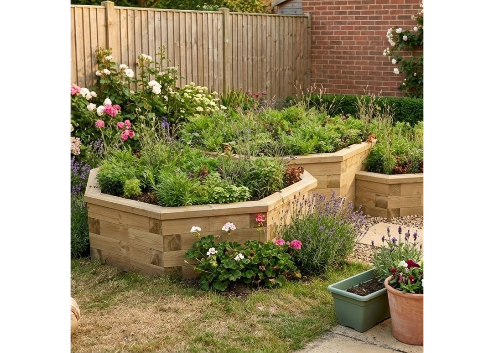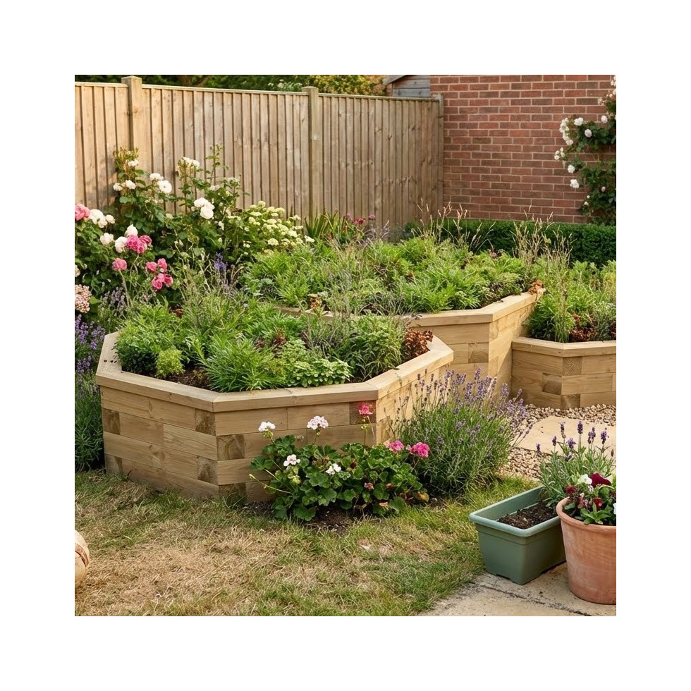 Toto členité osminranné dílo vám nabízí spoustu možností využití. Tři navazující záhony mohou tvořit tři různé zóny pro odlišné tipy rostlin - bylinky, letničky, trvalky nebo sukulenty. Opravdu neotřelý prvek pro vaši zahradu.