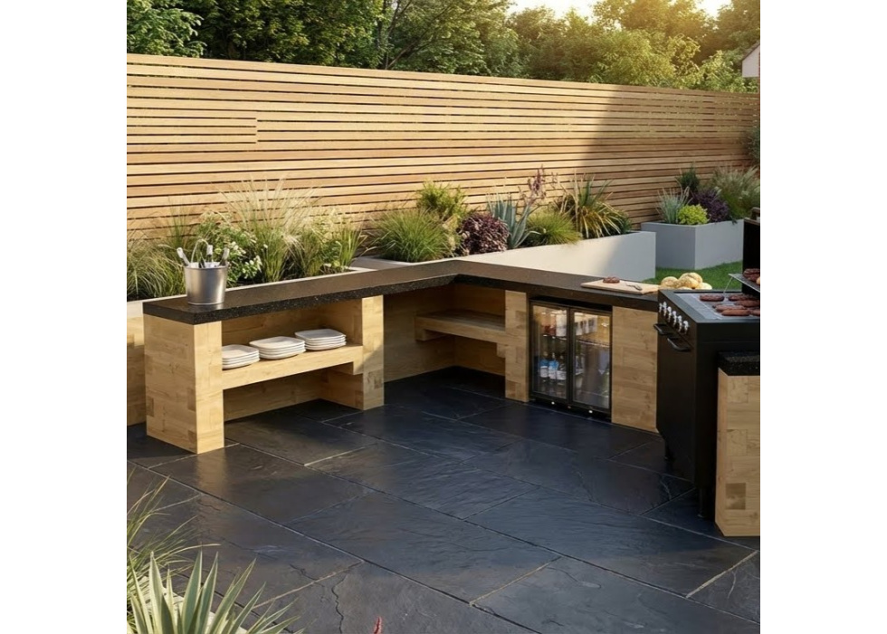 Stavba venkovní kuchyně nebyla nikdy jednodušší! Tato venkovní kuchyňská sestava má vše, co potřebujete, včetně 3 taburetů, prostoru pro gril i lednici. Stačí jen sestavit jako lego a doplnit pracovní desku dle libosti.
